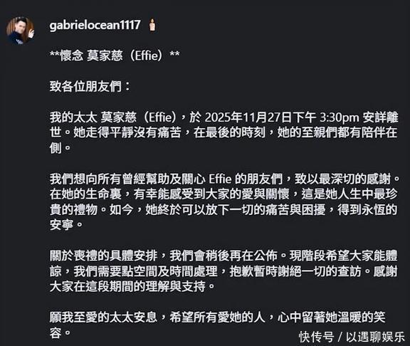 全文如下:“怀念 莫家慈(Effie)*致各位朋友:我媳妇儿莫家慈(Effie),���日下𴃓点半,安详走了。她走得很平静,没有什么痛苦,最后的时候,亲人们都在她身边陪着。咱们想对所有曾经帮助和关心 Effie 的朋友们,表示最真诚的感谢!在她这一辈子里,能感受到身边人给予的爱和关心,真是她一生中最宝贵的财富。现在,她终于可以把那些烦心事和痛苦都放下,过上永远的安宁生活了。关于丧礼的具体安排,我们稍后再告诉大家。现在希望大家能够理解,我们需要一些时间和空间来处理事情,抱歉暂时不方便接待大家的查访。感谢大家这段时间的理解和支持,真心谢谢你们!希望我心爱的媳妇能得以安息,也愿所有爱她的人都能记住她那温暖的笑容。“这是莫家慈的老公海俊杰给你问好!”